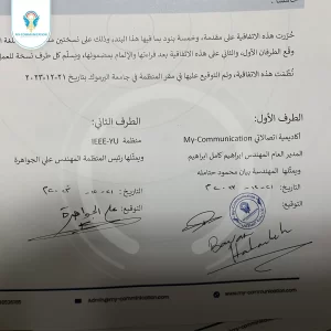 أكاديمية My Communication تحقق إنجازًا جديدًا بتوقيع اتفاقية مع منظمة IEEE في جامعة اليرموك، الأردن. هذه الشراكة تمثل خطوة هامة في تعزيز العلاقات الأكاديمية والعملية في مجال هندسة الاتصالات.